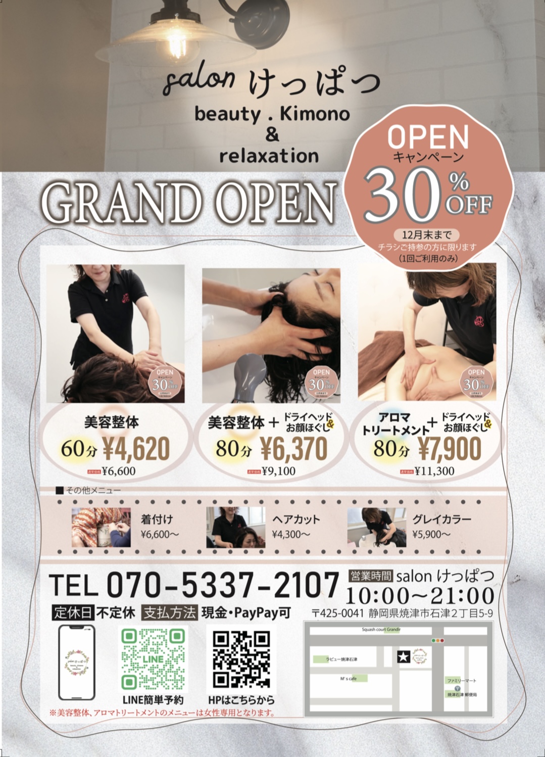 焼津 /石津 /小川 /道原 /祢宜島 /藤枝 /吉田/牧之原/榛原 /りらく/リラクゼーション/美容/整体/肩こり/頭痛/眼精疲労/首/肩甲骨/腰 /骨盤/産後/足/あし/フット /ハンド/手/歪み/姿勢 /女性 /更年期 /エイジング/健康/未病/エステ/フェイシャル/アロマ /オイル /リンパ/ほぐし/着付け/成人/成人式 /振り袖/ヘアセット/セット/アレンジ/美容室/美容院 /大人/出張/お顔/ヘッドスパ/ドライヘッドスパ /小顔 /リフト/リフトアップ /ほうれい線/眼精疲労/冷え/冷え性 /寝不足/睡眠不足/むくみ/女性専用/チラシ/紹介/男性/惣右衛門/移転/Open /Google/ホットペッパー/先着/プレゼント/セブン/AEON焼津/ラ・カスタ /シャンプー/トリートメント/髪質改善/こり/ブロー/安心/ナイト/夜/20:00